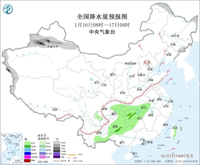 1月16日08时至17日08时,新疆北部和西南部、西藏西部、黑龙江北部、四川西部等地部分地区有小到中雪或雨夹雪,其中,新疆沿天山地区和伊犁河谷等地部分地区有大雪或暴雪(10~16毫米)。湖北中南部、湖南西部和北部、重庆、贵州、广西北部、云南南部等地部分地区有小到中雨。内蒙古中部、辽东半岛、山东半岛等地部分地区有4~5级风(见图3)。渤海将有6~7级风,阵风8级。