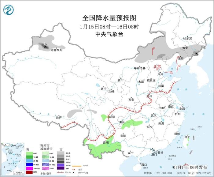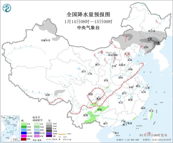 1月14日08时至15日08时,新疆北部、西藏东部、内蒙古中东部、黑龙江南部、吉林、辽宁中东部、山西北部等地部分地区有小到中雪,其中,吉林东南部等地部分地区有大雪,局地有暴雪(10~12毫米)。贵州中南部、云南东部、广东东南部沿海、台湾岛东部等地部分地区有小雨。内蒙古中西部、陕西北部、山西北部等地部分地区有4~6级风(见图1)。黄海南部、巴士海峡、南海东北部海域将有5~7级风,阵风8级。